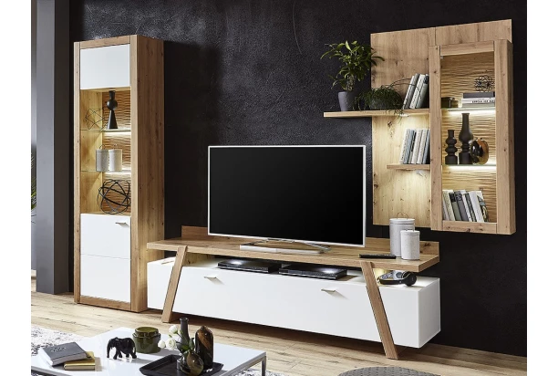 Obývacia stena z kolekcie Selma je moderný kvalitný nábytok s nádychom útulnej tradície dreva. Zaujímavý dizajn, podtrhuje široká podnož v optike masívneho dreva a štruktúrované povrchy vnútri vitrín, ktoré skvele vyniknú po nasvietení.
