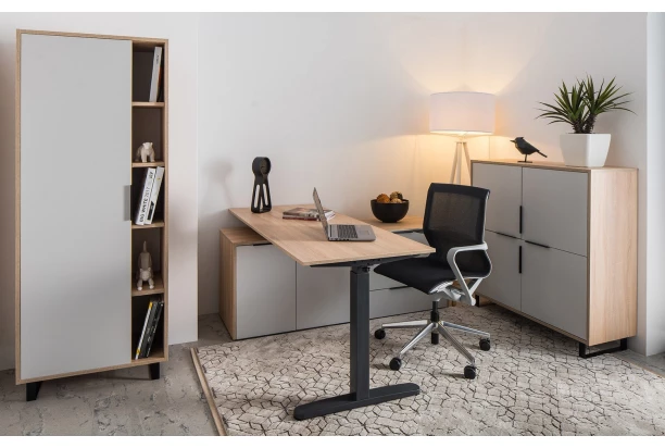 Kovová podnož k písaciemu stolu v antracitovom prevedení a s elektricky výškovo nastaviteľným mechanizmom Vám spríjemní prácu – pomocou panela s tlačidlami si pracovnú plochu stola kedykoľvek, ľahko a rýchlo prispôsobíte aktuálnej potrebe. Môžete tak pracovať striedavo posediačky aj postojačky, čo ocení hlavne Váš chrbát.