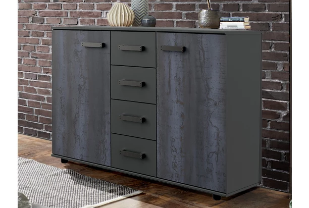 Komoda so šírkou 130 cm s kombináciou dverí a zásuviek z kolekcie Göteborg, zaujme na pohľad imitáciou šedej vintage ocele. Ideálne doplní mladistvý interier v mestskom industriálnom štýle.