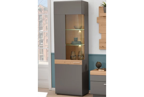 Vysoká vitrína s osvetlením z kolekcie Lucera – moderný trendový nábytok pre zariadenie útulného obývacieho priestoru. Príjemná kombinácia drevodekoru dub artisan so šedými plochami vyzerá skvele a vytvorí príjemné domáce prostredie. .