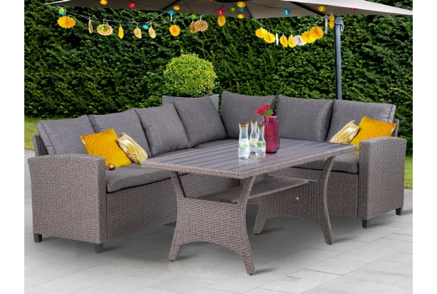 Záhradná rohová lavica s jedálenským stolom a vankúšmi, bude obľúbeným miestom pre pohodlnú relaxáciu a trávenie spoločných chvíľ na čerstvom vzduchu vo vašej záhrade. Stabilná konštrukcia z kovu a umelej imitácie šedého ratanu je ideálnou voľbou do vonkajšieho prostredia. Vrátane taburetu so sedacím vankúšom.