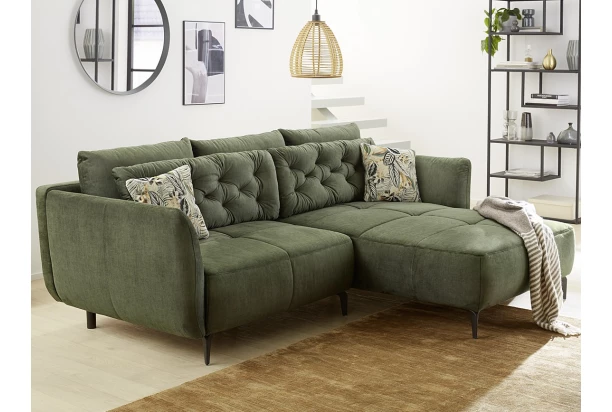 Elegantná rohová sedacia súprava s množstvom oporných vankúšov pre váš každodenný komfort. Kvalitnú velúrovú látku vo farbe zelená zvýrazňuje atraktívne prešitie a malé farebné vankúšiky s rastlinným vzorom. Vďaka kovovým nožičkám je sedačka stabilná a zároveň umožňuje ľahkú údržbu podlahy. Priestranný otoman je možné ľubovoľne umiestniť na pravú alebo ľavú stranu sedačky a vytvoriť si tak pravý alebo ľavý roh – sedačka tak bude ľahko pasovať takmer do akéhokoľvek priestoru obývačky. Po odobratí všetkých vankúšov získate komfortnú plochu, kde môžete pohodlne relaxovať alebo príležitostne prespať. Plochu sedačky môžete individuálne navyše zväčšiť po prisunutí doplnkového taburetu.