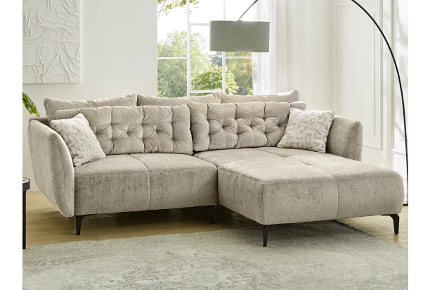 Elegantná rohová sedacia súprava s množstvom oporných vankúšov pre váš každodenný komfort. Mäkkú žinilkovú látku vo farbe béžová zvýrazňuje atraktívne prešitie a malé šedé vankúšiky s moderným vzorom. Vďaka kovovým nožičkám je sedačka stabilná a zároveň umožňuje ľahkú údržbu podlahy. Priestranný otoman je možné ľubovoľne umiestniť na pravú alebo ľavú stranu sedačky a vytvoriť si tak pravý alebo ľavý roh – sedačka tak bude ľahko pasovať takmer do akéhokoľvek priestoru obývačky. Po odobratí všetkých vankúšov získate komfortnú plochu, kde môžete pohodlne relaxovať alebo príležitostne prespať. Plochu sedačky môžete individuálne navyše zväčšiť po prisunutí doplnkového taburetu.