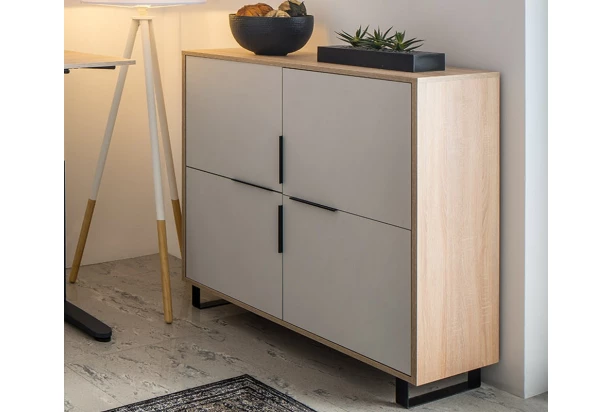 4-dverová komoda z kolekcie Home Office – kvalitný český nábytok pre zariadenie modernej domácej kancelárie, pracovne, prípadne akejkoľvek miestnosti Vášho bytu. Z jednotlivých dielov možno ľahko vytvoriť prostredie plné ergonómie podľa Vašich aktuálnych potrieb. Nábytok v kombinácii v dekore dub sonoma/svetlosivá/čierny kov je moderným a zároveň nadčasovým riešením.