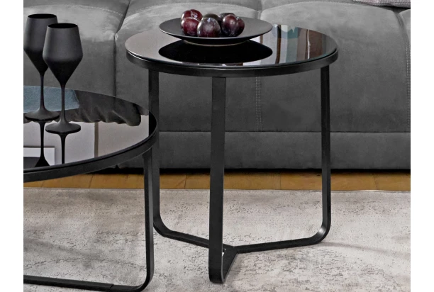 Moderný okrúhly konferenčný stolík s priemerom 50 cm z čierneho skla a čierneho kovu. Skvele sa bude hodiť napríklad k nábytku na kovových nôžkach alebo s čiernymi kovovými doplnkami. Tento stolík môžete kombinovať aj s väčším stolíkom Boston s priemerom 80 cm – oba stolíky tak môžu spolu tvoriť zaujímavú kompozíciu vo vašej obývačke.