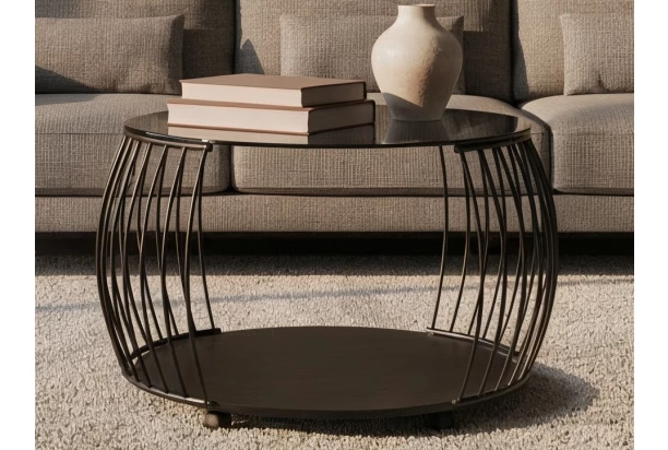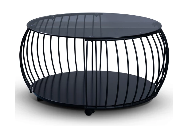 Okrúhly konferenčný stolík s priemerom 80 cm v modernom zaoblenom dizajne pôsobí v obývačke vzdušne. Čierny kov a dymovo šedé sklo dopĺňajú odkladacie police a koliečka, vďaka ktorým stolík ľahko premiestniť. Stolík sa hodí nielen k sedačke a pohovke, ale aj vedľa kresla.