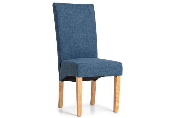 Elegantná jedálenská stolička s vysokým operadlom sa hodí do každej jedálne. V kombinácii modrého látkového čalúnenia a nožičiek z masívneho dreva.