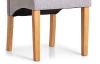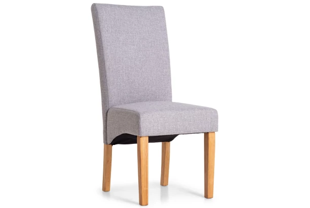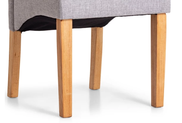 Elegantná jedálenská stolička s vysokým operadlom sa hodí do každej jedálne. V kombinácii svetlo sivého látkového čalúnenia a nožičiek z masívneho dreva.