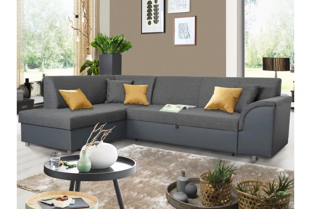 Rohová sedacia súprava so zaoblenou podrúčkou, ľavým otomanom, rozkladacou funkciou a úložným priestorom. Očalúnenie kombináciou antracitová ekokoža/tmavo šedá tkanina. Elegantné tvary sedačky pasujú do každého bytu.