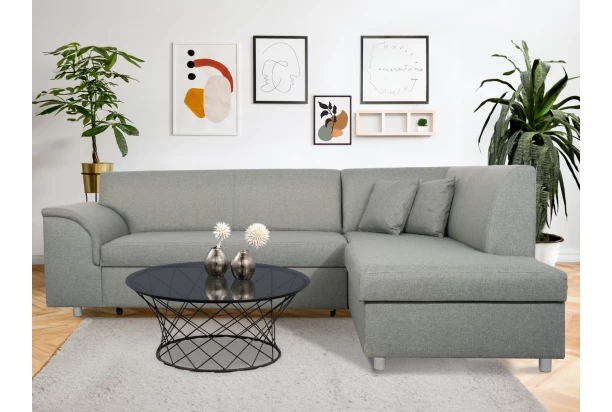 Rohová sedacia súprava so zaoblenou podrúčkou, pravým otomanom, rozkladacou funkciou a úložným priestorom. Očalúnená tkaninou vo farbe svetlo šedá. Elegantné tvary sedačky pasujú do každého bytu.