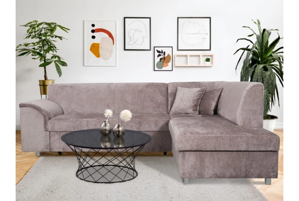 Rohová sedacia súprava so zaoblenou podrúčkou, pravým otomanom, rozkladacou funkciou a úložným priestorom. Očalúnená mäkko štruktúrovanou látkou vo farbe ružová. Elegantné tvary sedačky pasujú do každého bytu.