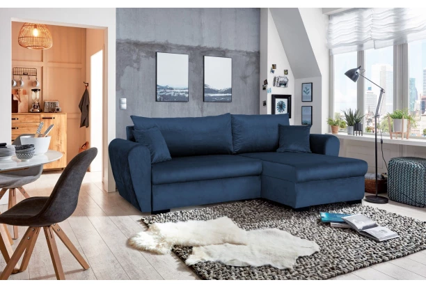 Malá rohová sedačka v zaoblených tvaroch poskytne pohodové sedenie aj v neveľkom priestore obývačky. Očalúnená zamatovo mäkkou látkou vo farbe modrá. Otoman je možné umiestniť na pravú alebo ľavú stranu – podľa priestorových možností. Okrem úložného priestoru pod sedákom ponúka aj rozklad na príležitostné spanie napríklad pre vašu návštevu.