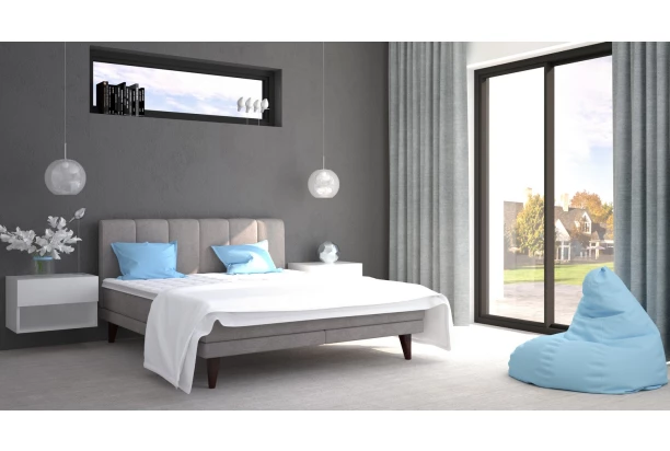 Pohodlná posteľ s plochou lôžka 180×200 cm zaujme vysokým polstrovaným čelom so zvislým prešivom. Očalúnená príjemne mäkkou látkou vo farbe svetlo šedá. Odolný matrac zo studenej peny sa vyznačuje dlhou životnosťou, elasticitou, priedušnosťou a poskytuje veľmi komfortný spánok.