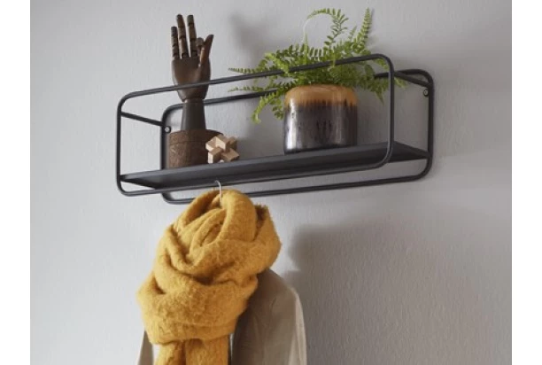 Nástenná polica so šatníkovou tyčou je vyrobená z čierneho kovu a skvele sa hodí nielen do predsiene. Policu na kovovej konštrukcii môžete využiť aj ako klasický regál v akejkoľvek miestnosti. Na dolnú tyč môžete prípadne ľahko zavesiť ramienka s oblečením.