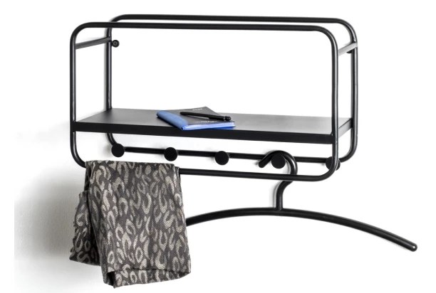 Nástenný vešiak s odkladacou policou je vyrobený z čierneho kovu a skvele sa hodí nielen do predsiene. Na 5 závesných háčikoch môžete vešať kabáty, bundy alebo kabelky. Na hornú poličku ľahko odložíte ďalšie doplnky alebo dekorácie.