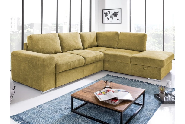 Rohová sedačka Eddi sa svojim univerzálnym štýlom hodí do každého interiéru a vďaka svojim rozmerom nájde svoje miesto takmer v každom rohu miestnosti, kde vytvorí pohodlné zákutia. Rohová sedacia súprava je vybavená úložným priestorom pod otomanom a vytvára pravý roh. Je očalúnená príjemne mäkkou štruktúrovanou látkou v odtieni žltá. Sedačku je možné vďaka rozkladacej funkcii ľahko premeniť na lôžko na príležitostné spanie.