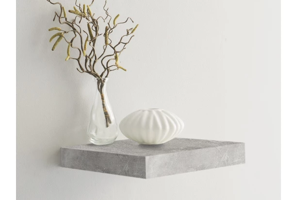Police na stenu o šírke 23,5 cm v imitácii sivý betón – jednoduchý univerzálny design pasuje do každého interiéru aj miestnosti. Kovové konzoly na zavesenie sú prakticky ukryté zo zadnej strany.