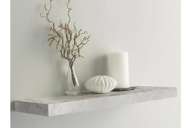 Polica na stenu so šírkou 60 cm v imitácii sivý betón – jednoduchý univerzálny design pasuje do každého interiéru aj miestnosti. Kovové konzoly na zavesenie sú prakticky ukryté zo zadnej strany.