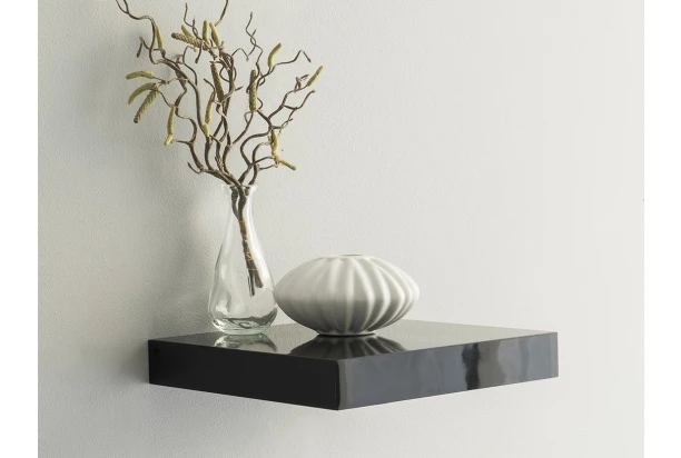 Polica na stenu o šírke 23,5 cm vo farbe lesklá čierna – jednoduchý univerzálny design pasuje do každého interiéru aj miestnosti. Kovové konzoly na zavesenie sú prakticky ukryté zo zadnej strany.