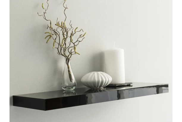 Polica na stenu so šírkou 60 cm vo farbe lesklá čierna – jednoduchý univerzálny design pasuje do každého interiéru aj miestnosti. Kovové konzoly na zavesenie sú prakticky ukryté zo zadnej strany.