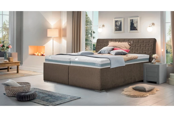 Elegantná dvojlôžková posteľ s veľkosťou 180×200 cm zaujme geometricky prešívaným čelom, ktoré pôsobí útulne a trendy. Očalúnená príjemne mäkkou látkou vo farbe hnedá. Posteľ je vybavená lamelovými roštami s funkciou polohovania a objemnými úložnými priestormi, do ktorých môžete uložiť napríklad lôžkoviny alebo sezónne veci.