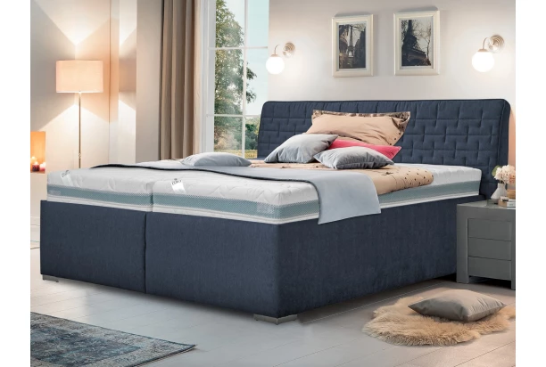 Elegantná dvojlôžková posteľ o veľkosti 180×200 cm zaujme geometricky prešívaným čelom, ktoré pôsobí útulne a trendy. Očalúnená príjemne mäkkou látkou vo farbe námornícka modrá. Posteľ je vybavená lamelovými roštmi s funkciou polohovania a objemnými úložnými priestormi, do ktorých môžete uložiť napríklad lôžkoviny alebo sezónne veci.