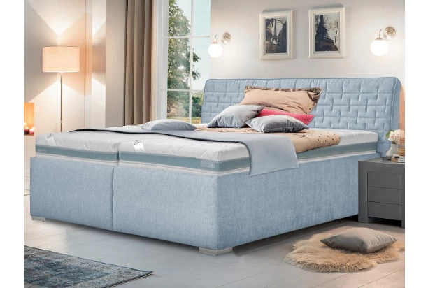 Elegantná dvojlôžková posteľ o veľkosti 180×200 cm zaujme geometricky prešívaným čelom, ktoré pôsobí útulne a trendy. Očalúnená príjemne mäkkou látkou vo farbe pastelová svetlo modrá. Posteľ je vybavená lamelovými roštmi s funkciou polohovania a objemnými úložnými priestormi, do ktorých môžete uložiť napríklad lôžkoviny alebo sezónne veci.