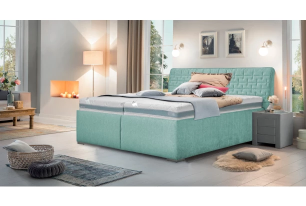Elegantná dvojlôžková posteľ o veľkosti 180×200 cm zaujme geometricky prešívaným čelom, ktoré pôsobí útulne a trendy. Očalúnená príjemne mäkkou látkou vo farbe modro-zelená aqua. Posteľ je vybavená lamelovými roštmi s funkciou polohovania a objemnými úložnými priestormi, do ktorých môžete uložiť napríklad lôžkoviny alebo sezónne veci.