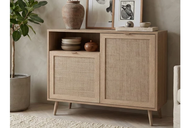 Skrinka 2-dverová z kolekcie Bali – vytvorte si útulný a zároveň krásne zariadený domov v prírodnom štýle. Atraktívny nábytok vo svetlých tónoch drevodekoru dub sonoma spolu s úžasnou imitáciou lykového výpletu dodá vášmu interiéru príjemne hrejivú atmosféru. Štýlový prírodný dizajn nábytku, podčiarkujú masívne drevené nôžky, vďaka ktorým môžete ľahko udržovať podlahu v byte.