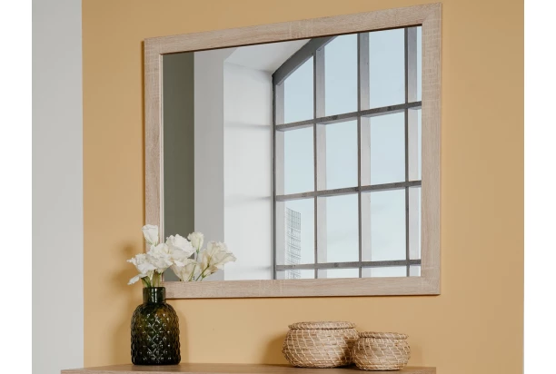 Nástenné zrkadlo v ráme z kolekcie Bali – vytvorte si útulný a zároveň krásne zariadený domov v prírodnom štýle. Rám zrkadla s veľkosťou 80×70 cm vo svetlých tónoch drevodekoru dub sonoma dodá vášmu interiéru príjemne hrejivú atmosféru.