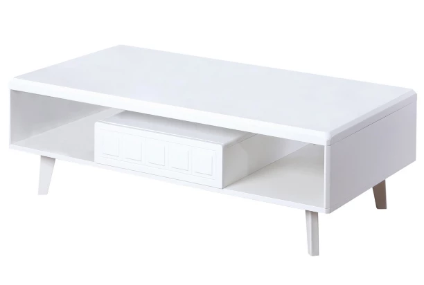 Lesklý biely konferenčný stolík v modernom dizajne, zaujme na pohľad zaujímavo skosenými tvarmi. Ponúka priestrannú odkladaciu priehradku aj dve praktické zásuvky na ukladanie drobností.