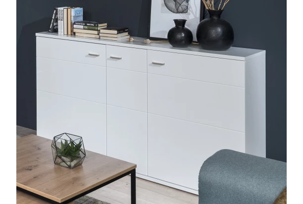 Komoda so šírkou 150 cm v kombinácii matná biela/lesklá biela z kolekcie Dawson – nábytok v nadčasovom prevedení je ideálnym riešením pre moderný a zároveň kvalitne zariadený byt. Za troma otočnými dverami nájdete úložné priestory a police.