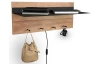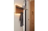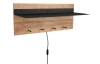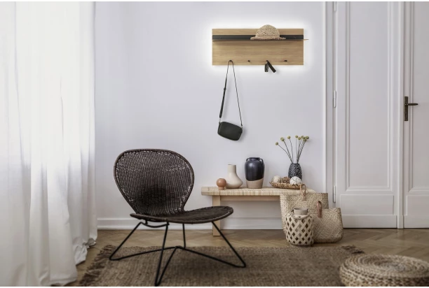 Drevený nástenný vešiak o šírke 75 cm v trendy farebnej kombinácii hnedá/čierna ponúkne veľa miesta na oblečenie. Bundy a kabáty, rovnako ako tašky a čiapky je možné zavesiť na 4 kovové háčiky. Praktická kovová polica je ideálna na odloženie drobných doplnkov, ako sú kľúče alebo peňaženka. Zadná strana vešiakového panelu s LED pásikom, ktorý vytvorí príjemné osvetlenie.