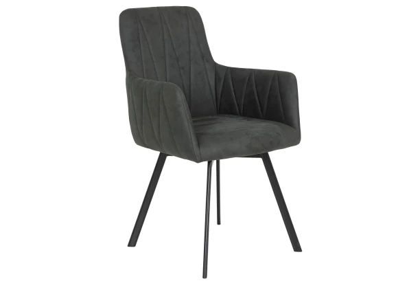 Atraktívne prešitá jedálenská stolička s otočným sedákom má tvar malého kresielka a v priestore jedálne pôsobí štýlovo. Pohodlne tvarovaný sedák je očalúnený príjemne mäkkou látkou vo vintage optike kože v odtieni antracitová tmavo šedá.