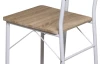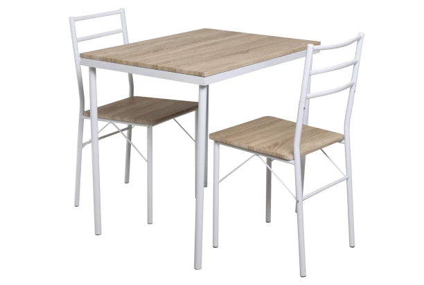 Malý jedálenský set pre dve osoby dobre poslúži v menšom priestore kuchyne alebo v kúte obývačky. Obsahuje jedálenský stôl a dve stoličky. Biela kovová konštrukcia s dubovým drevodekorom sa hodí do takmer akejkoľvek kuchyne.