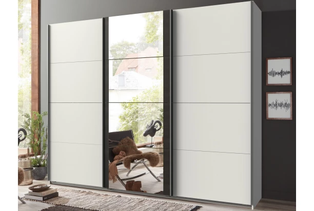 Šatníková skriňa so šírkou 225 cm a štandardnou výškou 208 cm s 3 posuvnými dverami ponúka praktické členenie vnútorného priestoru s 2 šatníkovými tyčami a 2 policami pre prehľadné ukladanie oblečenia, priestor je možné ľahko doplniť ďalšími policami. Biele plochy skrine dopĺňa imitácia antracitovej brúsenej ocele so zrkadlom uprostred.