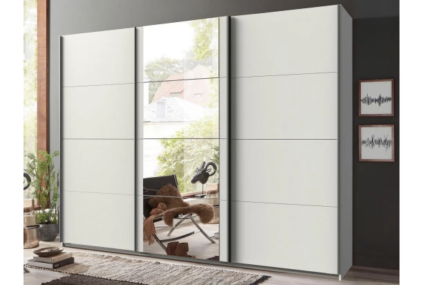 Šatníková skriňa so šírkou 270 cm a EXTRA výškou 236 cm s 3 posuvnými dverami ponúka praktické členenie vnútorného priestoru s 3 šatníkovými tyčami a 3 policami pre prehľadné ukladanie oblečenia, priestor je možné ľahko doplniť ďalšími policami. Táto biela skriňa je doplnená zrkadlom uprostred.