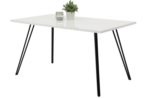 Biely jedálenský stôl o veľkosti 140×80 cm má lesklý povrch a čierne kovové nohy v zaujímavom dizajne. Obdĺžnikový stôl sa tak bude ľahko v interiéri kombinovať s ďalším nábytkom v lesklo bielom prevedení alebo k čiernym kovovým doplnkom.