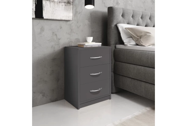 Jednoduchý nočný stolík v dekore šedý grafit s 3 zásuvkami. Univerzálny do každej spálne alebo detskej izby.