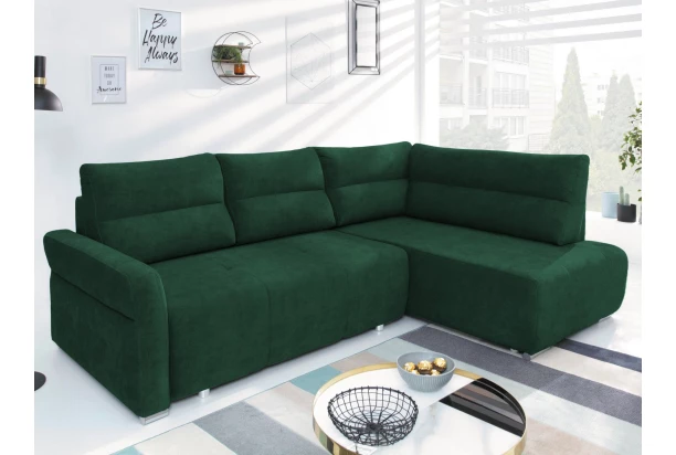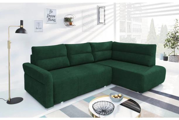 Priestranná rohová sedačka s pohodlne tvarovanými vankúšmi poslúži prakticky v malom aj veľkom byte. Očalúnená látkou vo farbe tmavo zelená a vytvára pravý roh. Vďaka rozkladacej funkcii na lôžko o veľkosti 140×210 cm je vhodná aj na trvalé spanie pre dve osoby. Môže byť teda napríklad vhodným riešením do malých bytov, kde poslúži cez deň ako rohová sedacia súprava av noci ako lôžko pre komfortné spanie, ktoré je možné behom chvíľky ľahko rozložiť.