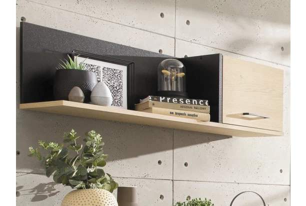 Nástenná polica s úložným priestorom z programu Madison – nábytok v dubovom drevodekore s čiernymi plochami vnesie do interiéru moderný kontrast a zároveň útulnosť. Kombináciou s ďalšími dielmi tohto nábytkového programu môžete zariadiť celý obývací priestor v jednom ucelenom štýle.