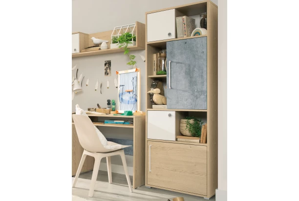 Vysoká skrinka so 4 priehradkami z programu Step – nábytok v zaujímavej kombinácii drevodekoru dub/biela/imitácia šedý betón je ideálny pre vybavenie detskej i študentskej izby, pre chlapcov i pre dievčatá. Vďaka svojej univerzálnosti je možné nábytok použiť aj do pracovne, kancelárie i obývacej izby.