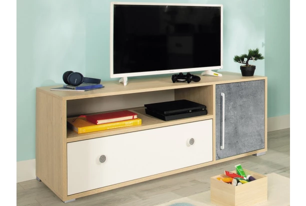 Televízna skrinka z programu Step – nábytok v zaujímavej kombinácii drevodekoru dub/biela/imitácia šedý betón je ideálny pre vybavenie detskej i študentskej izby, pre chlapcov i pre dievčatá. Vďaka svojej univerzálnosti je možné nábytok použiť aj do pracovne, kancelárie i obývacej izby.
