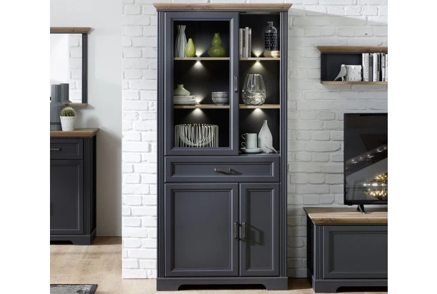Široká vitrína v prevedení grafit s dubovým drevodekorom z kolekcie Jasmin – nábytok v modernom vidieckom štýle s dôrazom na detail nadväzuje na tradíciu útulne zariadeného domova a priamo láka k tomu, aby ste si vytvorili prostredie, kde sa budete cítiť dobre. Kombinujte tak jednotlivé elementy z tohto radu a vytvorte si štýlový rustikálny interiér s nádychom tradície.