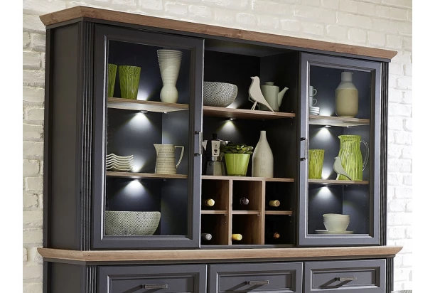 Nástavná vitrína s priehradkami a osvetlením v prevedení grafit s dubovým drevodekorom z kolekcie Jasmin – nábytok v modernom vidieckom štýle s dôrazom na detail nadväzuje na tradíciu útulne zariadeného domova a priamo láka k tomu, aby ste si vytvorili prostredie, kde sa budete cítiť dobre. Kombinujte tak jednotlivé elementy z tohto radu a vytvorte si štýlový rustikálny interiér s nádychom tradície.