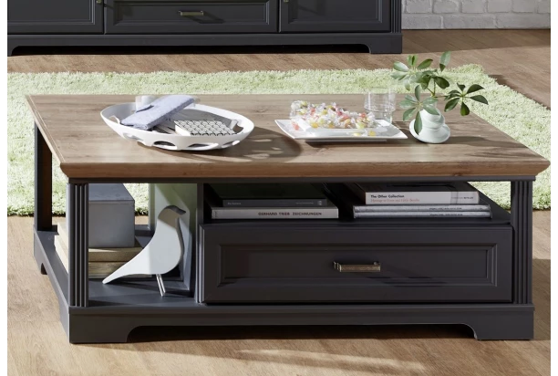 Konferenčný stolík so zásuvkou a priehradkami v prevedení grafit s dubovým drevodekorom z kolekcie Jasmin – nábytok v modernom vidieckom štýle s dôrazom na detail nadväzuje na tradíciu útulne zariadeného domova a priamo láka k tomu, aby ste si vytvorili prostredie, kde sa budete cítiť dobre. Kombinujte tak jednotlivé elementy z tohto radu a vytvorte si štýlový rustikálny interiér s nádychom tradície.