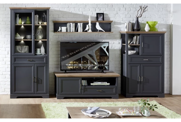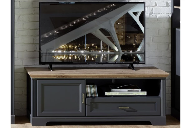 TV skrinka so šírkou 143 cm v prevedení grafit s dubovým drevodekorom z kolekcie Jasmin – nábytok v modernom vidieckom štýle s dôrazom na detail nadväzuje na tradíciu útulne zariadeného domova a priamo láka k tomu, aby ste si vytvorili prostredie, kde sa budete cítiť dobre. Kombinujte tak jednotlivé elementy z tohto radu a vytvorte si štýlový rustikálny interiér s nádychom tradície.