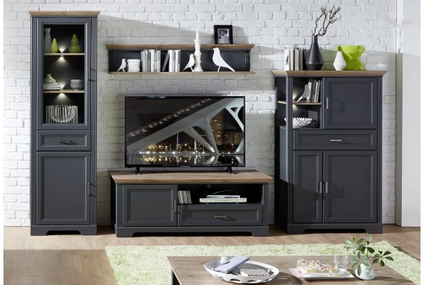 Vysoká vitrína s osvetlením v prevedení grafit s dubovým drevodekorom z kolekcie Jasmin – nábytok v modernom vidieckom štýle s dôrazom na detail nadväzuje na tradíciu útulne zariadeného domova a priamo láka k tomu, aby ste si vytvorili prostredie, kde sa budete cítiť dobre. Kombinujte tak jednotlivé elementy z tohto radu a vytvorte si štýlový rustikálny interiér s nádychom tradície.