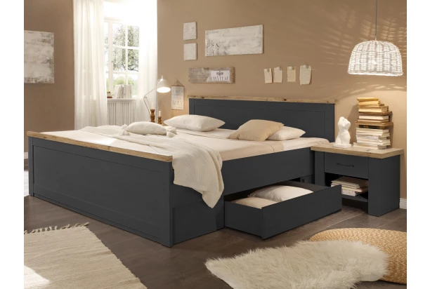 Manželská posteľ s veľkosťou lôžka 180×200 cm s nočnými stolíkmi z kolekcie Locarno – elegantný vidiecky štýl podčiarkujú dekoratívne reliéfy predných plôch a kombinácia grafitovej farby s útulnými tónmi drevodekoru dub artisan. Oceníte aj vyššiu konštrukciu postele pre ľahšie vstávanie a bočné zásuvky na uschovanie lôžkovín.