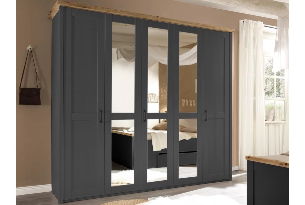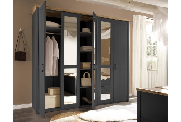Šatníková skriňa so šírkou 241 cm z kolekcie Locarno – elegantný vidiecky štýl podčiarkujú dekoratívne reliéfy predných plôch a kombinácia grafitovej farby s útulnými tónmi drevodekoru dub artisan. 5-dverová konštrukcia so zrkadlami ponúka prehľadné úložné priestory na ukladanie početného ošatenia.